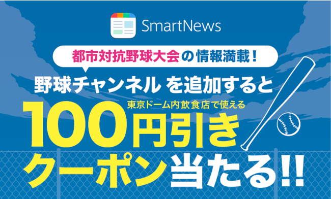スマートニュース株式会社は、ニュースアプリ「SmartNews」の「野球チャンネル」にて、毎日新聞社主催の「第93回都市対抗野球大会」(以下:都市対抗野球大会)とコラボレーションし、全31試合のダイジェスト映像を配信するなど「都市対抗野球大会」に関する最新情報を配信。あわせて、試合日に球場の飲食売店で使える限定クーポンをプレゼントする抽選企画を開催します。「都市対抗野球大会」とは、毎年夏に東京ドームにて開催される、日本最大の社会人野球トーナメント大会です。今年は、2022年7月18日(月・祝)~2022年7月29日(金)にて開催され、日本全国より32チームが集まり頂点を競います。毎年40万人以上が来場する本大会。SmartNewsでは、都市対抗野球大会出場チームならびに選手を応援する皆様の力になれるよう、今回の企画をご用意しました。