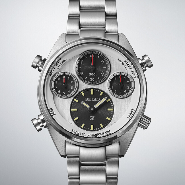 1/100秒単位で経過時間を計測できるストップウオッチ機能を備え、時刻表示と積算表示を完全に独立させて視認性を高めたダイヤルレイアウトが特徴のソーラークロノグラフモデル。初代「ローレル」のカラーリングにある赤を、ストップウオッチの針に採用。「スピードタイマー ソーラークロノグラフ1/100秒計測」では初となる、レザーストラップが付属します。