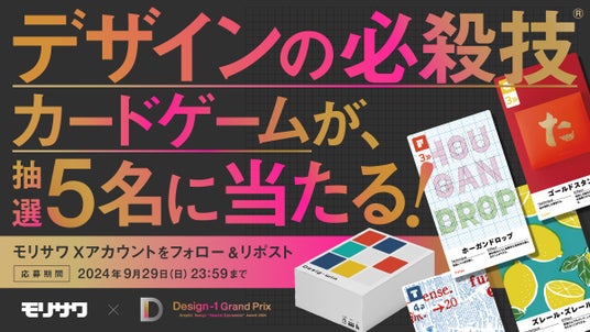 株式会社モリサワ(代表取締役社長:森澤彰彦 本社:大阪市浪速区敷津東2-6-25 Tel:06-6649-2151 代表、以下モリサワ)は、株式会社NASU(代表取締役:前田高志、本社:大阪市、以下NASU)主催による新しいデザインアワード「Design-1 グランプリ(デザインワングランプリ)2024」に協賛します。これを記念し、NASUが運営するクリエイターコミュニティ「マエデ」が制作した人気のカードゲーム「Desig-win(デザウィン)」をプレゼントするSNSコラボキャンペーンを実施します。