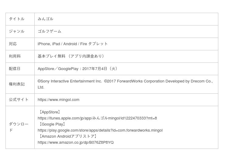 『みんゴル』は、「プレイステーション」を代表する作品のひとつ「みんなのGOLF」シリーズの“誰でも簡単にゴルフゲームを楽しめる”というコンセプトを、スマートフォンの特性や、プレイスタイルに合わせて最適化し、誰もが、いつでもどこでも、爽快ショットで手軽にゴルフゲームをお楽しみいただけます。