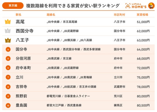 事業を通して社会課題解決に取り組む、株式会社LIFULL(本社:東京都千代田区、代表取締役社長:伊東祐司、東証プライム:2120)が運営する不動産・住宅情報サービス「LIFULL HOME'S(ライフルホームズ)」は、住まい探しの選択肢を広げるべく、「複数路線が利用できる家賃の安い駅ランキング」を発表します。