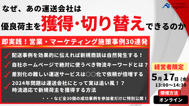 国内最大級のロジスティクス・物流コンサルティングファーム船井総研ロジ株式会社(東京本社:東京都千代田区、代表:菅重宏、以下「船井総研ロジ」)は、2023年5月17日(水)13:00~14:30運送会社・物流会社の経営者を対象に「明日から実践できる!新規荷主を獲得する営業施策事例30連発セミナー」をオンラインで開催いたします。