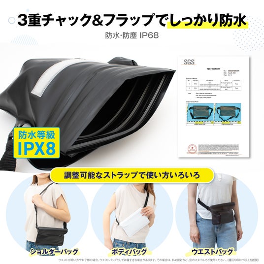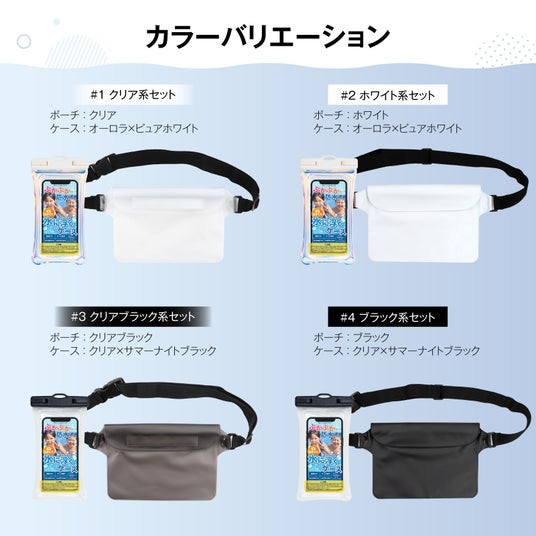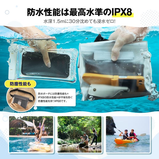 このセットは、高い防水性能(IPX8等級)を備え、スマートフォンや財布などの貴重品を水や汚れからしっかり守るため、海、川、プール、キャンプ、フェスなど夏のアクティビティに最適です。