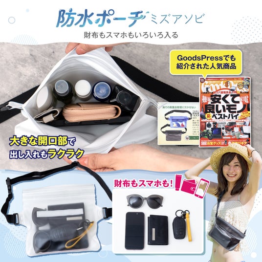 「ミズアソビ」は、防水防塵IP68等級の防水性能を備えた防水ポーチです。三重チャック構造とベルクロフラップが搭載されており、最大で水深1.5メートルまで耐えることができます。雑誌にも掲載された人気商品で、スマートフォンだけでなく、財布や鍵などの小物も安心して収納できます。アウトドアや旅行など、どんなシーンでも大切なアイテムを守ります。