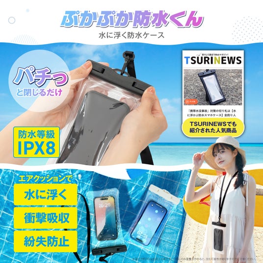 「スマホぷかぷか防水くん」は、IPX8等級の防水性能を誇り、スマートフォンを水に浮かせるエアクッション構造を採用しています。これにより、スマホが水中で沈むのを防ぎ、万が一の水没から守ります。FaceIDにも対応しており、スマホをケースに入れたままでSNSや動画を楽しむことができます。釣り雑誌公式サイトにも紹介された人気商品です。