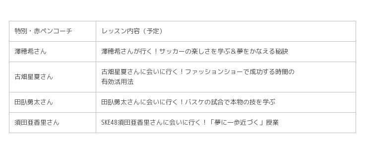 ※その他「特別・赤ペンコーチ」の皆さんのレッスン内容についてはキャンペーンサイトにて随時発表いたします。※レッスンの内容等は変わることがございます。最新の情報はキャンペーンサイトにてご確認ください。