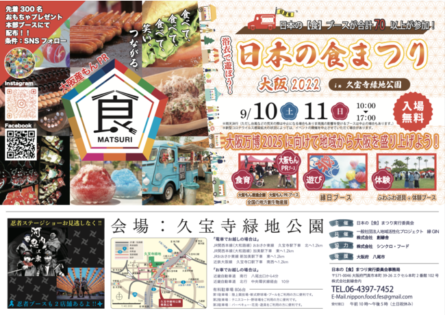 株式会社シンクロ・フード(本社:東京都渋谷区、代表取締役:藤代真一、東証プライム市場:3963)が運営するモビマルは、日本の食まつり実行委員会と、「日本の食まつり 大阪2022」を共催。9/10を皮切りに、半年間に渡り大阪府内の公園で開催します。毎回70以上、大阪産(もん)食材を中心とした食に関する様々なブースが参加します。