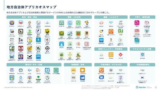 地方自治体アプリおよび自治体施策と関連するサービスのMAU上位アプリを主な機能別に分類すると、防災・防犯、ごみ分別、行政手続き、地域コミュニティ、健康施策、子育て支援、地域通貨など、行政サービスと生活領域を横断した多様なアプリが存在しており、地方自治体関連サービスの多様性が可視化されています。