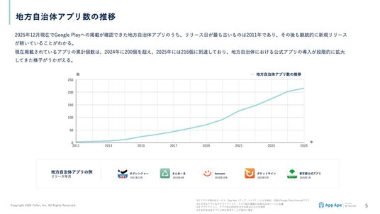現在掲載されているアプリの累計個数は、2024年に200個を超え、2025年には216個に到達しており、地方自治体における公式アプリの導入が段階的に拡大してきた様子がうかがえます。