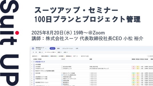 株式会社スーツ(所在地:東京都千代田区、代表取締役社長CEO:小松 裕介)は、2025年8月20日(水)19時から、当社代表の小松が講師を務めるスーツアップ・セミナー「100日プランとプロジェクト管理」を無料開催します。