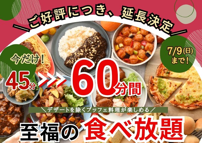 食べ放題のテーマパーク、 ニラックス株式会社(本社:東京都武蔵野市、 代表取締役社長:崎田 晴義)が運営する「ザ ブッフェ ニューマーケット」などのニラックスブッフェ13店舗にて実施中の『エキスプレスコース60分間延長キャンペーン』を、ご好評につき7/9(日)まで延長開催いたします!