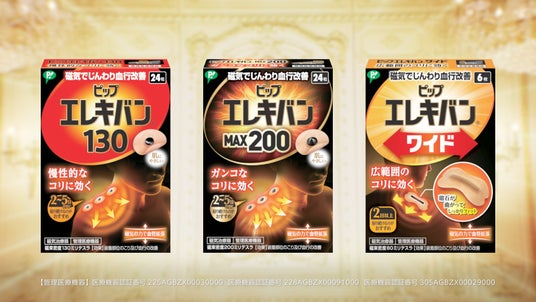 ピンポイントでコリを解消する「ピップエレキバン」。磁気が体内成分に働きかけ血行を良くし、コリの原因となる老廃物を流します。貼っている間中効果が続くので、2~5日間貼ることを推奨します。そのままお風呂にも入れます。磁力の強さを選べるため、コリの状態によって使い分けが可能。こっているな、と思うところを指で軽く押さえ「少し痛い、気持ちいい」と感じるところに貼ったり、必要に応じてその周囲にご使用ください。その他、首すじ専用設計で頑固なコリに効く「ピップエレキバンネックバンド」や、着けるだけで足裏のコリ・はりを手軽にケアする「ピップエレキバン足裏バンド」、背中まで広がったしつこい肩コリにアプローチする「ピップエレキバンインナークリップ」といった貼らないタイプの商品も展開しています。