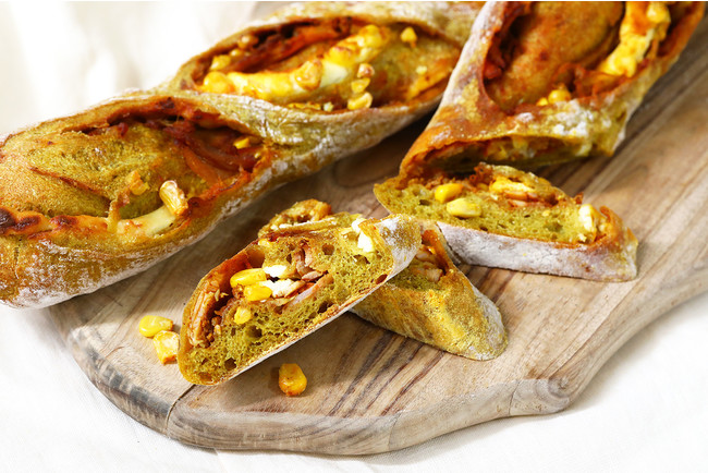 カレー粉を練りこんだ生地に、とうもろこし、タンドリーチキン、クリームチーズを包んで焼き上げた具沢山な季節のバゲットです。