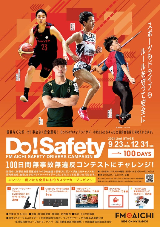 「Do! Safety」は、1999年より実施しているFM AICHIの交通安全キャンペーンで、今年2024年で26年目。年に2回、リスナー参加による「100日間無事故無違反コンテスト」を実施し、期間中無事故無違反を達成したリスナーに抽選で、豪華プレゼントが当たる、という企画です。セカンドステージは9月23日(月)から、100日後の12月31日(火)まで。コンテストへのエントリーはFM AICHIの「Do! Safety」公式ページから。個人エントリーの他、会社やファミリー・グループでのエントリーも受け付けています。