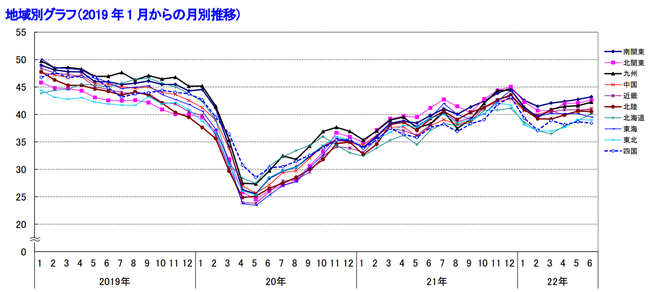 『北関東』(42.6):同0.5ポイント増。3カ月連続で改善。域内5県中4県が改善した。資材価格が上昇するなか木造建築で駆け込み需要が発生するなど『建設』が上向いた。一方『製造』は部材の納期延期などの影響もあり2カ月連続で悪化した。