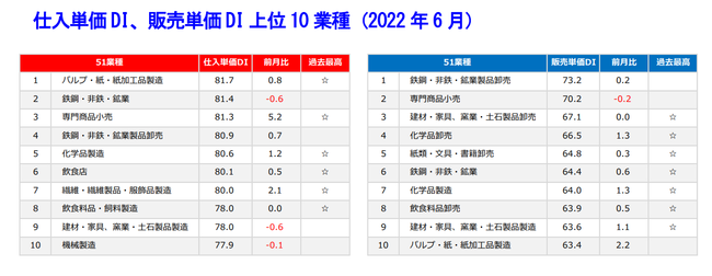 販売単価DIは、石油卸売などの「鉄鋼・非鉄・鉱業製品卸売」がトップ。「専門商品小売」も70を超える高水準。6業界25業種で過去最高水準