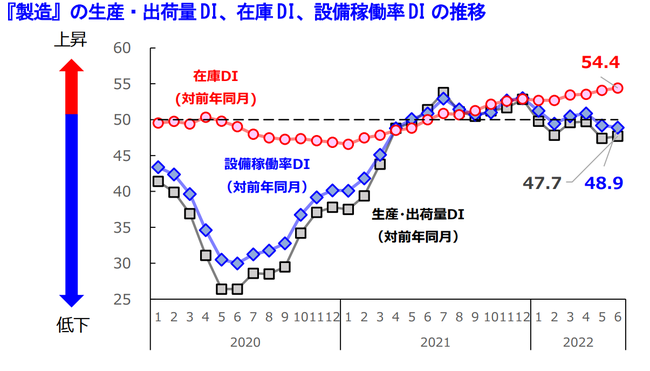 『製造』の生産・出荷量DI、設備稼働率DIは50を下回る水準で推移する一方、在庫DIは上昇傾向