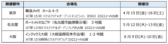 2022年4月15・16日に幕張メッセ(千葉市)で開催される、日本最大級のエクステリア専門展示会「第15回 エクステリア×ガーデンエキシビション(EXG)2022」への出展を皮切りに、名古屋・大阪の3都市(開催日順)で商品展示会「エクステリアフェア2022」を開催します。