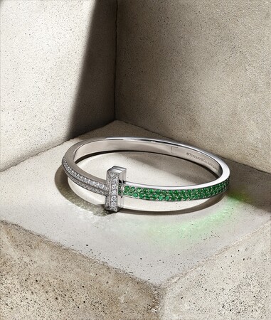 力強さを宿すお守りのようなティファニー T ワンは、それを纏うことで、その人が持つ勇気やパワーが表現されます。このエクスクルーシブな18KホワイトゴールドのT ワン ブレスレットは、計1カラットを超える105個のダイヤモンドが手作業でセットされ、計2カラットを超える74個のツァボライトがあしらわれています。ティファニーが1974年に世界に紹介して以来、ティファニーのレガシーとなっているジェムストーン、そしてツァボライトの鮮やかな緑色は、まるで彫像の古びた色彩とアーシャム スタジオのシンボルカラーの両方を呼応するかのようです。このような発見をしてきたティファニーのヘリテージは、アーシャムの未来的な「発見」の美とも一致します。