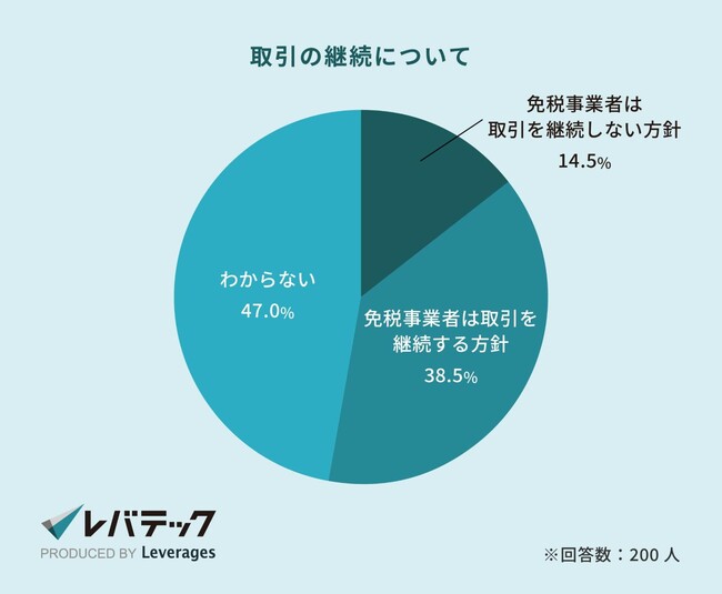 取引の継続については約5割で「わからない(47.0%)」が最多となり、ついで「免税事業者は取引を継続する方針(38.5%)」と続きます。