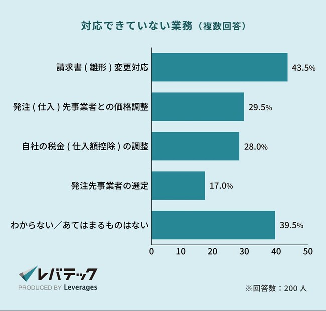 対応できていない業務について、「請求書(雛形)変更対応(43.5%)」が最も多く、ついで「発注(仕入)先事業者との価格調整(29.5%)」「自社の税金(仕入額控除)の調整(28.0%)」と続きます。