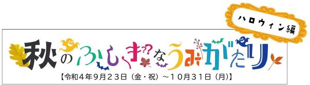 令和4年10月29日(土)にハロウィンに合わせた特別開館「うみがたりハロウィンナイト2022」を行います。春の「大人のおひとりさま水族館」、「年パス限定 前夜祭」などに続く、今年4回目の夜の特別開館です。