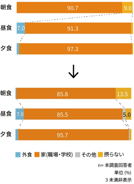 - 朝食、昼食、夕食をとる場所は、依然として「家(職場・学校)」がそれぞれ約86%以上を占めた