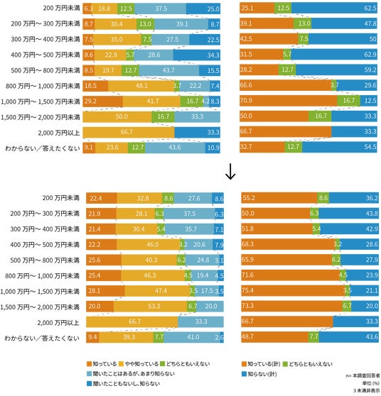 『知っている(計)』が「200万円未満 」、「400万円~500万円未満 」、「500万円~800万円未満 」で30pt以上増加し、この区分での認知が特に伸びている傾向にあります。