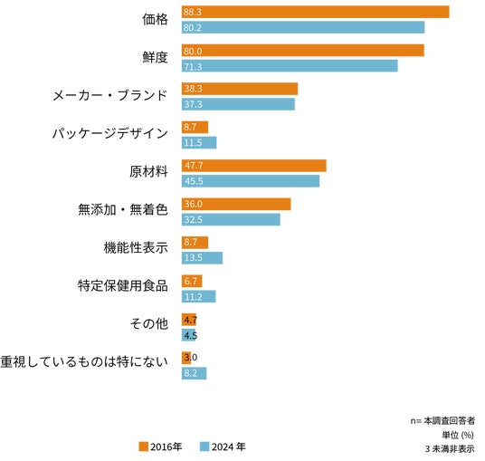 - 普段購入する時の重視することは、2016年も2024年もTOP3が価格、鮮度、原材料となった