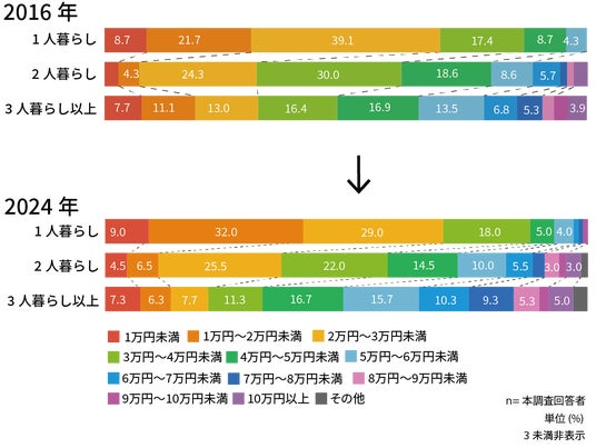『3人暮らし以上』で減少している区分が多いです。特に、「1万円未満」から「4万円~5万円未満 」までの区分で全て減少しており、「1万円~4万円未満 」の各区分はそれぞれ約5pt減少しました。