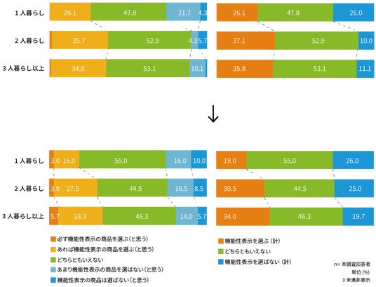 機能性表示の食品があった場合の購入について、『機能性表示を選ばない(計)』が約11pt増