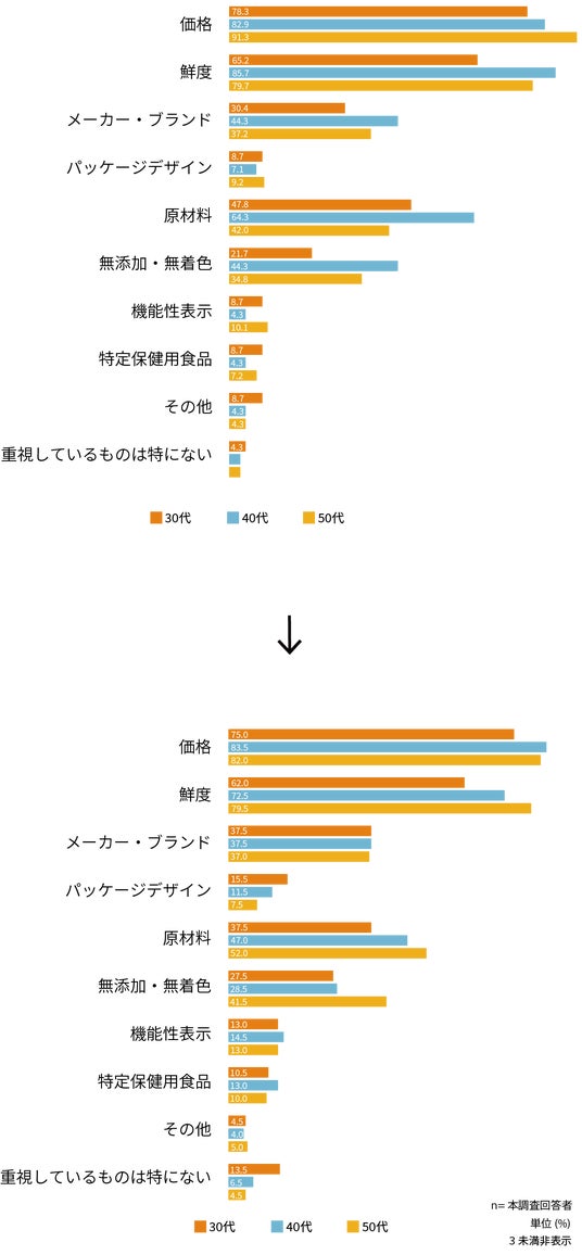 2016年も2024年もTOP3は、価格、鮮度、原材料となりました。一方で、価格と鮮度は、約8~9pt減少しました。