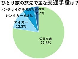 ひとり旅のおもな移動手段は公共交通が約7割 カーシェアリングサービスの利用もひとり旅の移動手段としておもに利用されているのは公共交通で、全体の77.6%。いっぽうで、マイカーを利用すると回答した読者は12.3%。レンタカー利用は6.8%にとどまりました。その他の回答ではカーシェアリングサービスの利用も見られました。「自動車移動中の暇が問題だったが、書籍の読み上げサービスの登場で有意義な時間を過ごせるようになった」といった回答も。