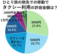 ひとり旅の旅先でのタクシー利用、払ってもいいと思う金額は?公共交通でなかなか行けない目的地への移動に便利なタクシー。タクシーに支払ってもいいと思える金額は、3000円までが最多の27.9%、続いて5000円までが23.7%。タクシーは使わない、といった回答は21.7%ありました。「ひとり旅だと割高になってしまうので、車でしか行けない場合にはレンタカーを選ぶ」、「乗り合いタクシーがあると助かる」といったコメントも見られました。