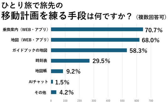 ひとり旅の旅先での移動についてはスマートフォンを駆使して計画を練るひとり旅の移動について計画を練る際には、WEBやアプリの乗換案内を使うといった回答が最多で実に70.7%の人が利用。続いてWEB・アプリの地図利用が68.0%となり、多くの人がスマートフォンを用いてひとり旅の移動計画を立てていることが分かりました。「地図が読めず方向音痴ですが、スマホの出現でひとり旅がスムーズに出来るようになりました」といった意見もありました。