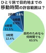 ひとり旅での目的地への移動時間の許容範囲は、「旅の目的のためなら時間は問わない」という読者が最多ひとり旅の際の移動時間がどれくらいまでなら許容範囲か、という質問に対して、最多だったのが「目的のためなら何時間でも」といった回答で63.5%。続いて3時間が12.4%、4時間が11.5%、5時間が9.0%など、比較的長時間の移動でも許容する傾向が見られました。移動時間*では、ゆっくり本を読む、音楽を聴く、気ままに居眠りをする、おやつをつまむ、などそれぞれひとりの時間を楽しんでおり、ここでも旅慣れた様子が伺えました。