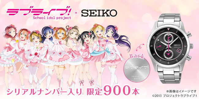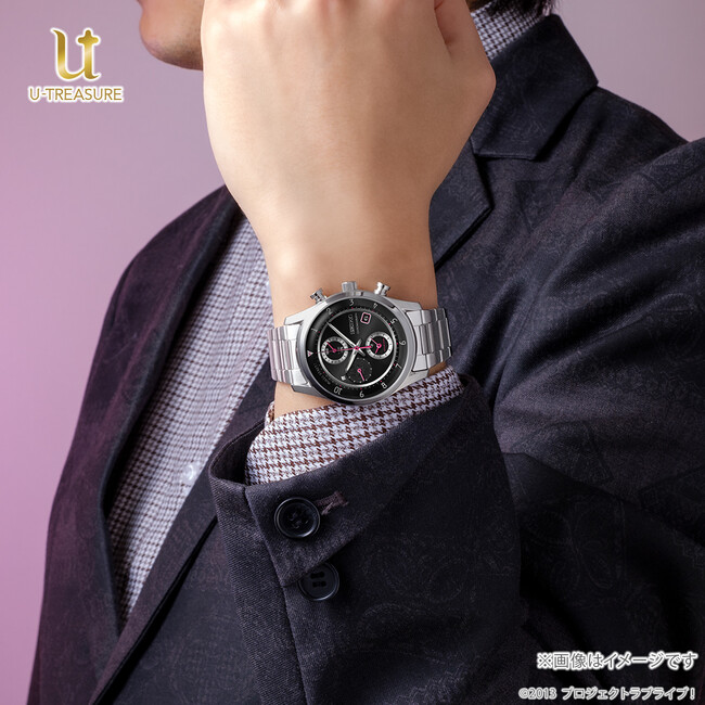 このたびの新作は、セイコーウオッチ株式会社とコラボし、TVアニメシリーズ『ラブライブ!』の放送10周年を記念したセイコークロノグラフの限定ウオッチです。文字盤、リューズ、裏蓋など随所に「μ’s(ミューズ)」の世界観を詰め込んだデザインになっています。10時位置には10年共に歩んでくれた感謝を象徴するようにクリスタルガラスをあしらいました。また、ライブでのカウントダウンパフォーマンスからインスピレーションを得た「music start!」の文字をさりげなく配置しました。900本の数量限定、裏蓋にはシリアルナンバーを刻印します。ユートレジャーコンセプトストア池袋、ユートレジャーオンラインショップ、アニメイト通販にて取り扱います。