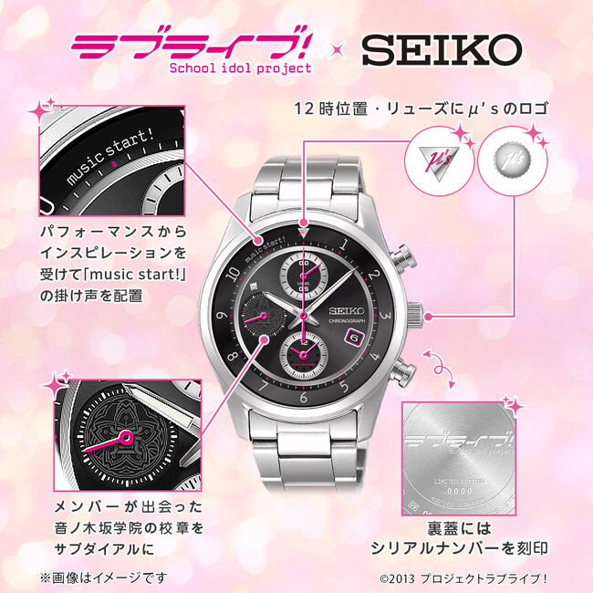 TVアニメシリーズ『ラブライブ!』放送10周年を記念した腕時計です。これからも共に時を刻んでいけるよう、オンオフ問わずデイリーに馴染むスタイリッシュなデザインに仕上げました。ライブ空間をイメージしたブラックの文字盤には、アクセントにグループのイメージカラーを採用。10時位置には10年共に歩んでくれたあなたへμ’sからの感謝を象徴するようにクリスタルガラスをセッティング。また、ライブでのカウントダウンパフォーマンスからインスピレーションを得た「music start!」の文字をさりげなく配置しました。6、9時位置のサブダイアルへは、それぞれのメンバーと同じ数のスターマークと音ノ木坂学院の校章をデザイン。リューズにはμ’sロゴをレーザーマーキング。裏蓋はシリアルナンバーが刻印され、専用のスペシャルボックスにお入れしてお届けします。随所に『ラブライブ!』の世界観を取り入れた、セイコー製の900本限定アニバーサリーウオッチをご堪能ください。