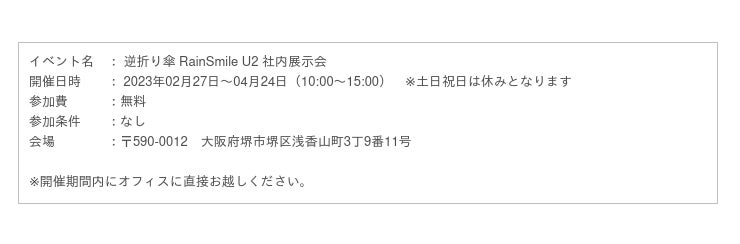 AFU ストア(運営会社:鑫三海株式会社、本社:大阪府堺市堺区、代表取締役:伴場 義通)は、応援購入サービスMakuakeにて先行販売中の逆折り傘 RainSmile U2 の社内展示会を2月27日~4月24日に開催することを決定しました。