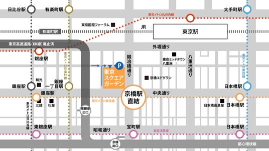 東京スクエアガーデンは、東京メトロ銀座線「京橋」駅に直結し、東京メトロ有楽町線「銀座一丁目」駅徒歩2分、羽田空港や成田空港に直通する都営地下鉄浅草線「宝町」駅徒歩2分、さらにはJR「東京」駅や銀座エリアも徒歩圏内と抜群のアクセスを誇る大規模複合ビルです。