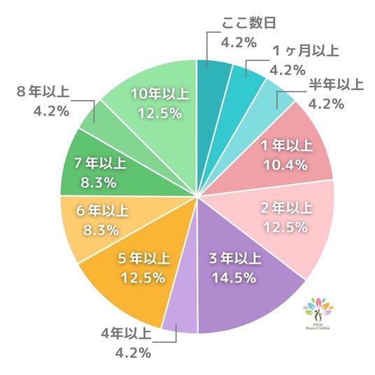 1年未満は12.6%で、3-4年が14.6%と一番多く、1-4年の間を合計すると37.5%、5年以上を合計すると45.8%でした。大半の方々が長期間に渡って祖父母とお子さんとの関係に困りごとを抱えていることがわかりました。