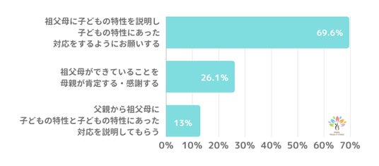 「祖父母に子どもの特性を説明し、子どもの特性にあった対応をするようにお願いする」 69.6%と多くの方がされた取り組みでした。祖父母にもママと同じように子どもの特性を理解して、その特性にあった対応をして欲しいと願われていることが伺えます。