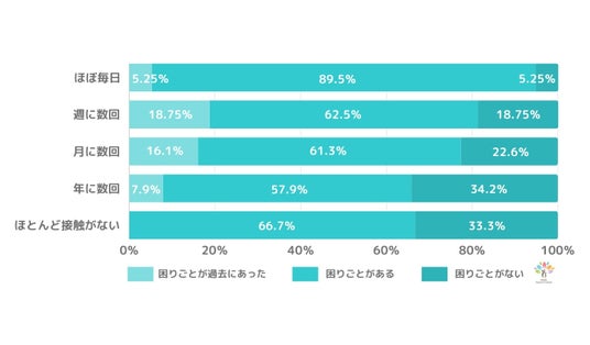 週に数回では、18.75%が過去に困りごとがあった、62.5%が困りごとがあると回答。 合わせると81.25%が困ったことがあることになります。月に数回では16.1%、61.3%、合わせて77.4%。年に数回では7.9%、57.9%、合わせて65.8%と接触する頻度が少なると困りごとがあると回答された方の割合は減っていました。