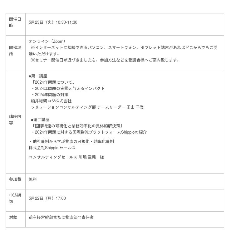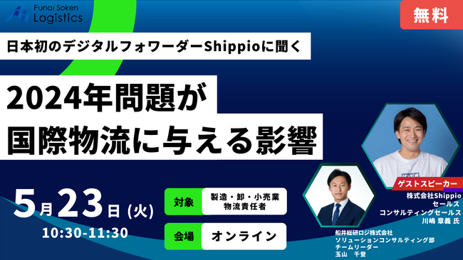 ロジスティクス・物流コンサルティングサービスを提供する船井総研ロジ株式会社(東京本社:東京都千代田区、代表:菅重宏、以下「船井総研ロジ」)は2023年5月23日(火)荷主経営幹部または物流部門責任者を対象とした「2024年問題 物流改善セミナー」をオンラインで開催いたします。