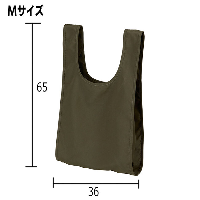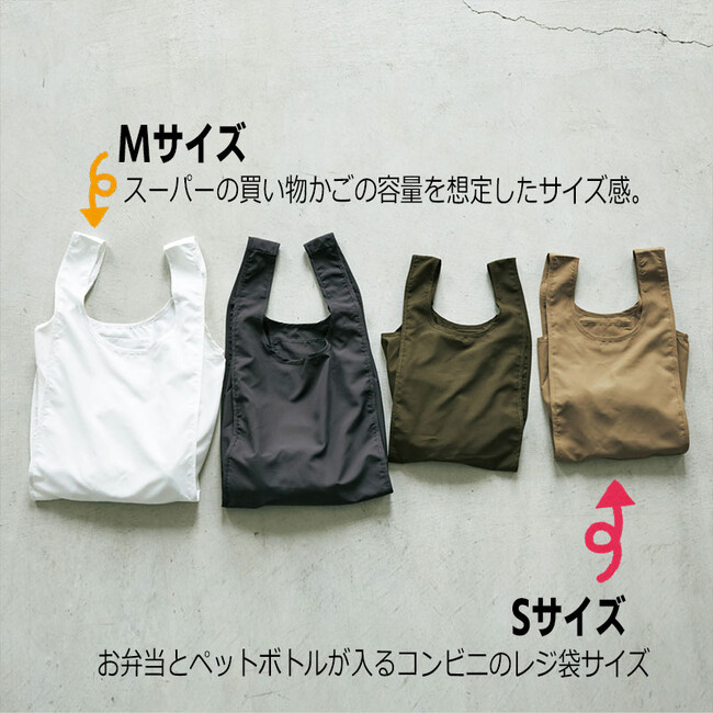 2サイズ展開で、Sサイズはお弁当とペットボトルが入るコンビニのレジ袋のサイズ感。Mサイズはスーパーの買い物かごの容量を想定したサイズ感。