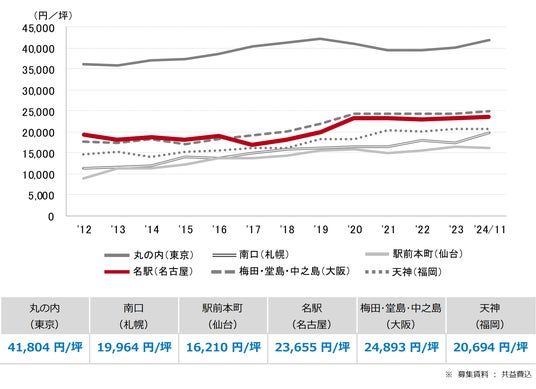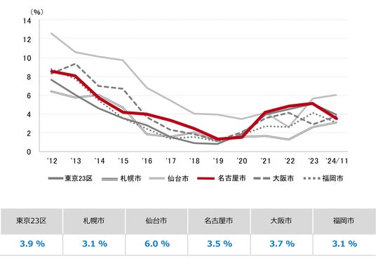 三幸エステート株式会社(本社:東京都中央区、取締役社長:武井重夫)は、2024年11月度の名古屋市オフィス賃貸状況(空室率&現空面積:全規模、募集賃料&募集面積:全規模、規模別空室率、主要エリア※1空室率:全規模)および全国6大都市(東京・札幌・仙台・名古屋・大阪・福岡)の大規模ビルのマーケットデータをまとめた「オフィスマーケット2024年12月号名古屋」を公表します。
