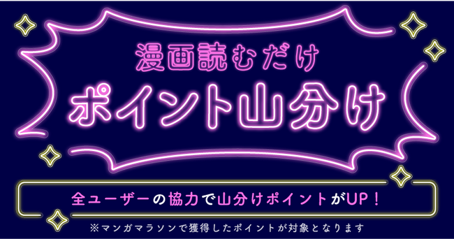 期間中全ユーザーが漫画を読んで獲得した総ポイント数と同数を、山分けして翌月に追加贈呈させていただきます。(マンガマラソンイベントのポイントをカウントいたします)