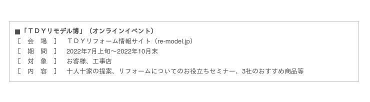 また、工事店の提案によって実現した暮らしの事例を2022年8月から募集を開始し、2025年度までにTDYリフォーム情報サイトへ100件の事例掲載を目指します。