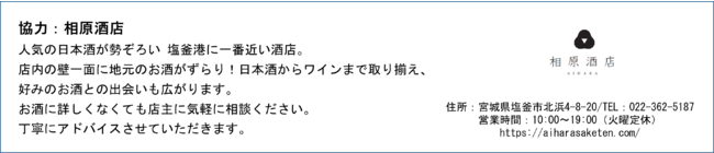 今回は、宮城を代表する8つの酒蔵が集結します。気仙沼の「角星」と「男山本店」、石巻の「平孝酒造」、塩竈の「佐浦」と「阿部勘酒造」、閖上の「佐々木酒造店」、特別出店として大崎の「一ノ蔵」、加美の「中勇酒造店」が集まり、各蔵自慢の銘酒、秘蔵酒を振る舞います。酒蔵自らがお酒を振る舞い、日本酒の魅力を伝えます。