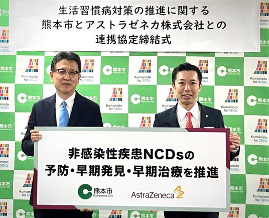 アストラゼネカ株式会社(本社:大阪市北区、代表取締役社長:堀井 貴史、以下、アストラゼネカ)と熊本県熊本市(市長:大西 一史、以下、熊本市)は、この度「生活習慣病(NCDs: 非感染性疾患)対策の推進等に関する連携協定」を締結しました。本協定のもと、熊本市が掲げる「全ての市民が生涯を通して住み慣れた地域で健康でいきいきと暮らせるまちの実現」に向け、生活習慣病をはじめとするNCDs発症予防及び早期発見・早期治療の推進による健康寿命の延伸に取り組んでまいります。